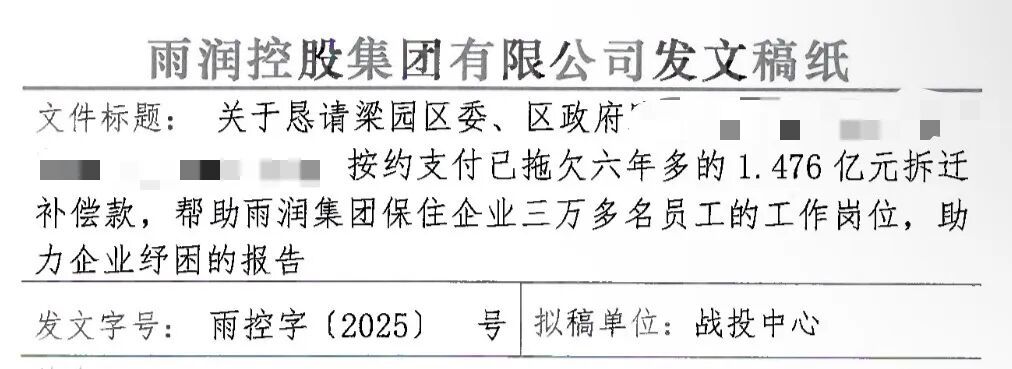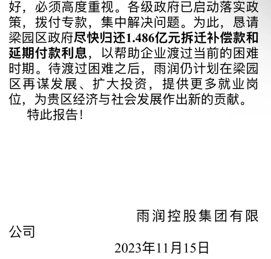 2023年底,雨润集团向梁园区政府发函,希望有关部门归还补偿款,帮助企业度过困难时期。