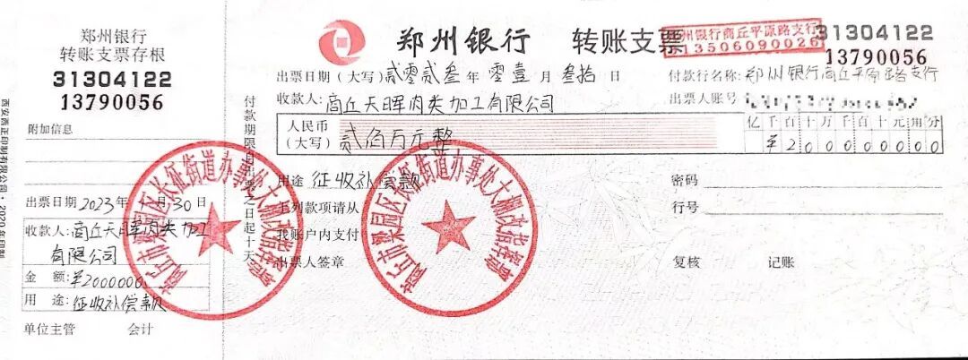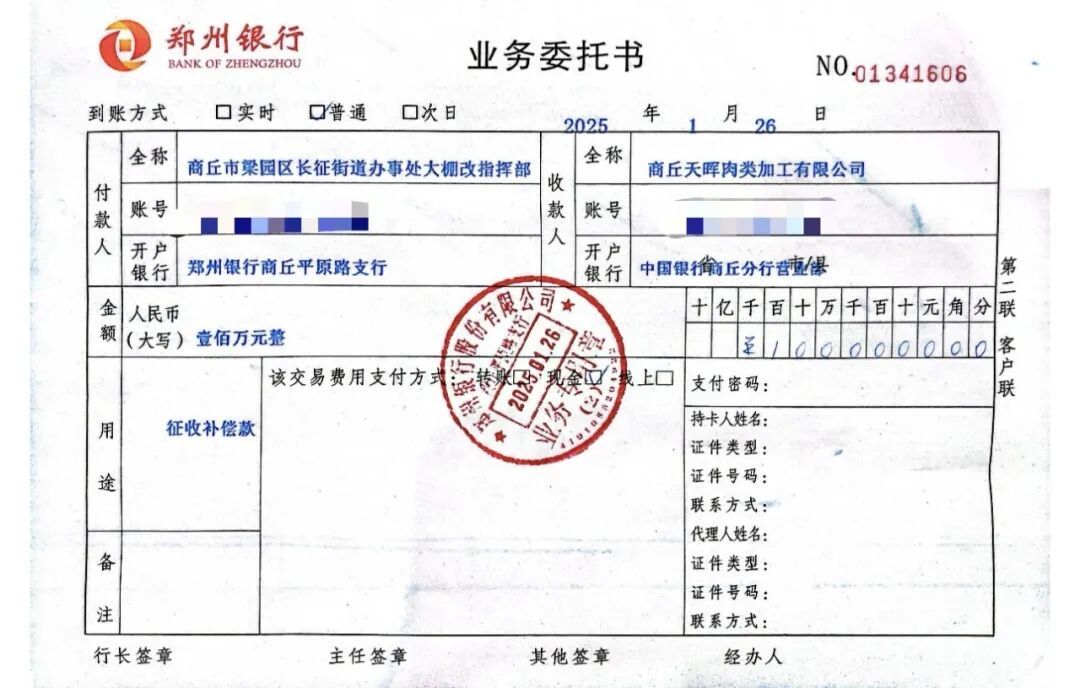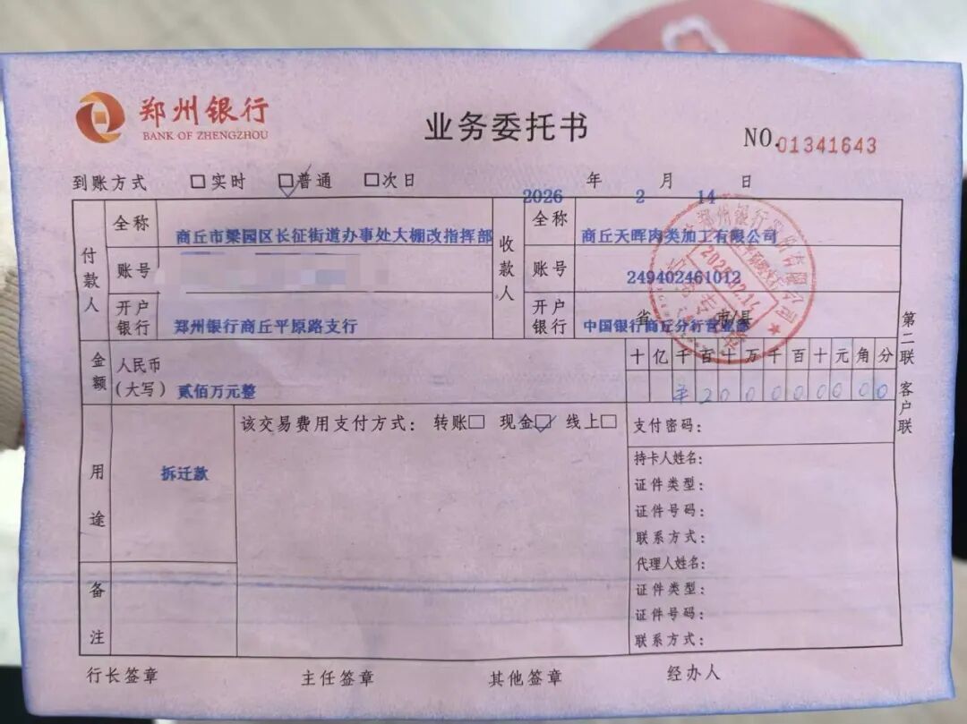2022年1月19日,梁园区市政建设局、天晖肉类加工公司、梁园区长征街道办事处三方签订了27份《房屋征收安置补偿协议》,总补偿金达1.5亿元。